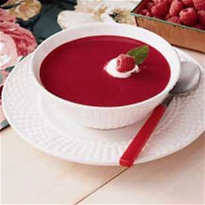 Ingredients - ​2 12oz bags frozen red raspberries- 1 ¼ cups water- ¼ cup white wine (optional)- 1 cup cran/raspberry juice- ½ cup sugar- 1 ½ teaspoons ground cinnamon- 2 whole cloves- 1 tablespoon lemon juice- 1 8oz container of low-fat raspberry yogurt- ½ cup low-fat sour creamInstructions - ​In a blender puree red raspberries, water and wine.- Pour into a large saucepan.- Add juice, sugar, cinnamon and cloves.- Over medium heat, bring to a boil, stirring constantly.- Remove from heat- Strain and let cool.- Add lemon juice and yogurt.- Refrigerate, for 1 hour.Serving Suggestions - ​Serve in soup bowls and top with a dollop of sour cream. Great for a warm summer's eve.